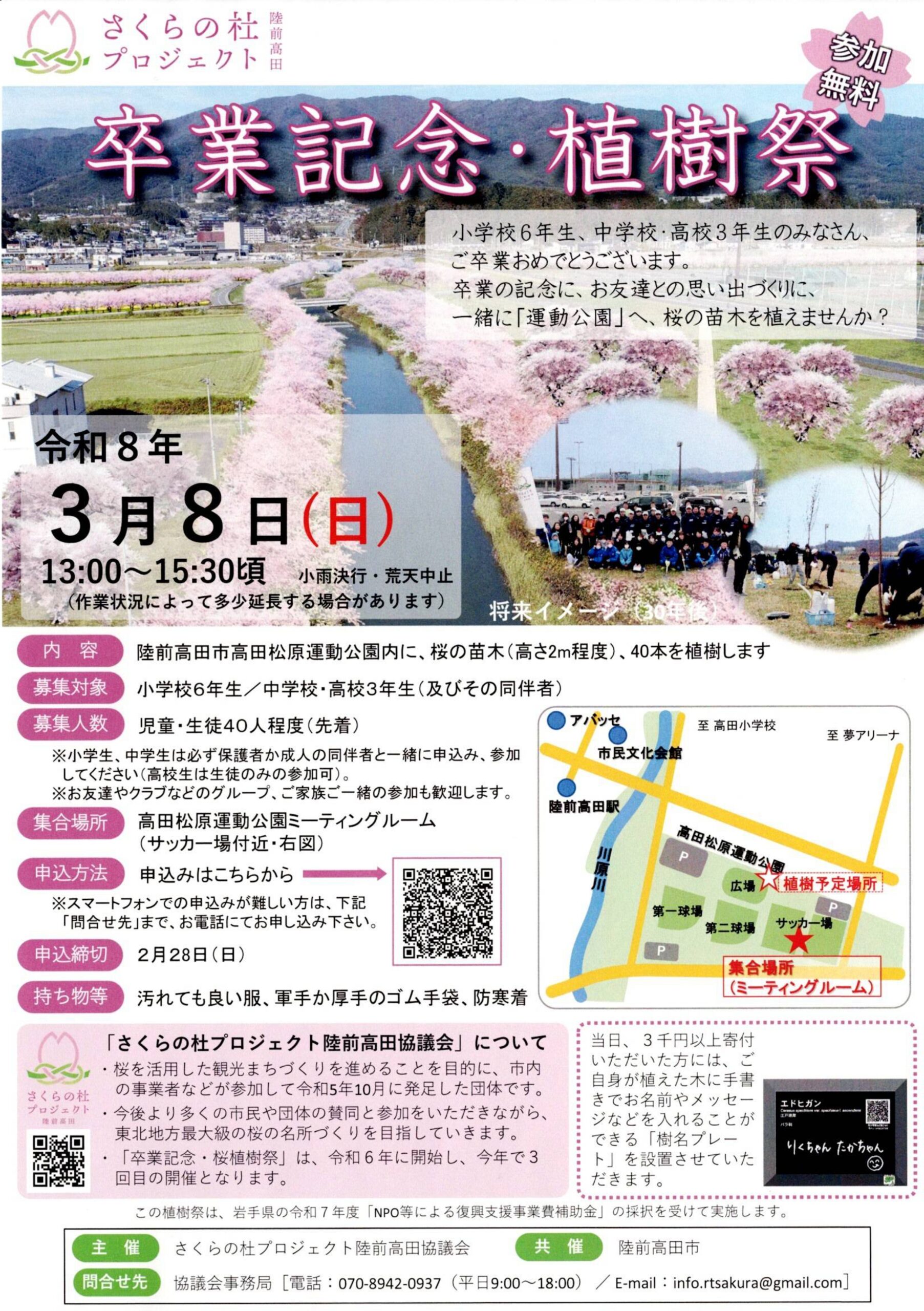 3月8日は、この春、陸前高田市の小・中学校を卒業する児童・生徒の皆さんや、卒業生でなくても、卒業を祝いたい方なら、どなたの参加も歓迎します。植樹場所は、高田松原運動公園内。